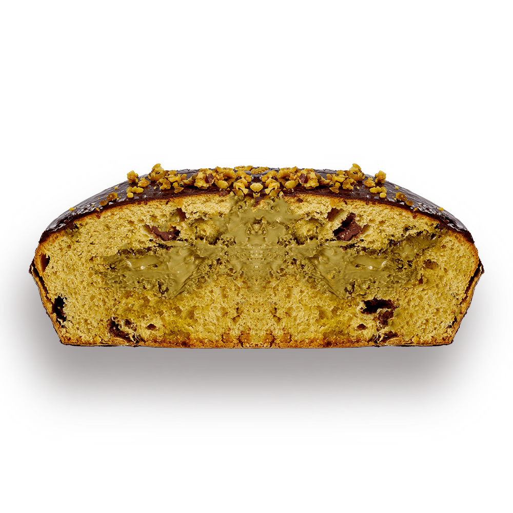 I sapori genuini del lievitato classico sono esaltati in questo soffice bauletto, in cui una glassa di cioccolato fondente e granella di pistacchi racchiude un impasto ricco di gusto grazie alla farcitura interna di cioccolato al latte e ganache al pistacchio.