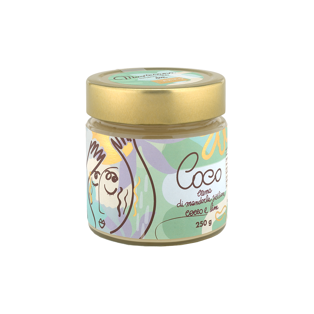 Mandorla siciliana (29%), zucchero di canna, grassi vegetali (olio di girasole, burro di cacao), pasta di cocco (14%) (di cui cocco 50%, zuccheri, aromi), lattosio, latte intero in polvere, olio di girasole, lime in polvere (0,5%), aroma naturale di vaniglia.