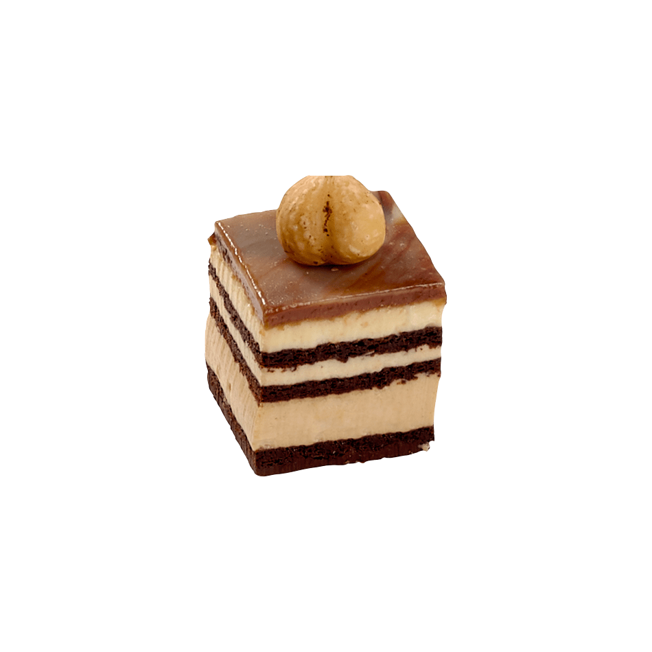Tre strati di Pan di Spagna al cacao senza farina separano una mousse alla nocciola e una mousse al cremino. Finitura marmorizzata con tre glasse: cioccolato al latte, bianco e cacao.