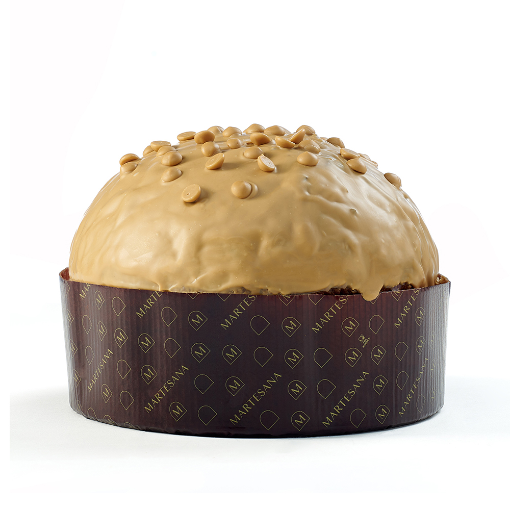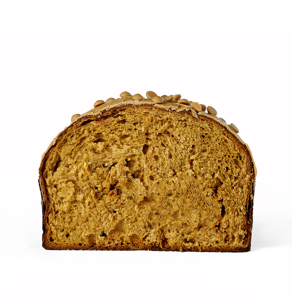Farina di GRANO tenero tipo”00”, Cioccolato bianco al caramello 20% (burro di cacao, zucchero, LATTE intero in polvere, LATTE magro in polvere, zucchero caramellizzato 2%, emulsionante: lecitina di SOIA, aroma naturale di vaniglia, sale), BURRO 16% (origine del LATTE: Paesi UE), Acqua, Zucchero di canna, Tuorlo d’UOVO sgusciato pastorizzato, da allevamenti a terra di origine: Italia, Lievito naturale (contiene GRANO), Burro di ARACHIDI 3% (ARACHIDI tostate 93%, olio di girasole, sale), Olio di riso, Sale, Bacche di Vaniglia.