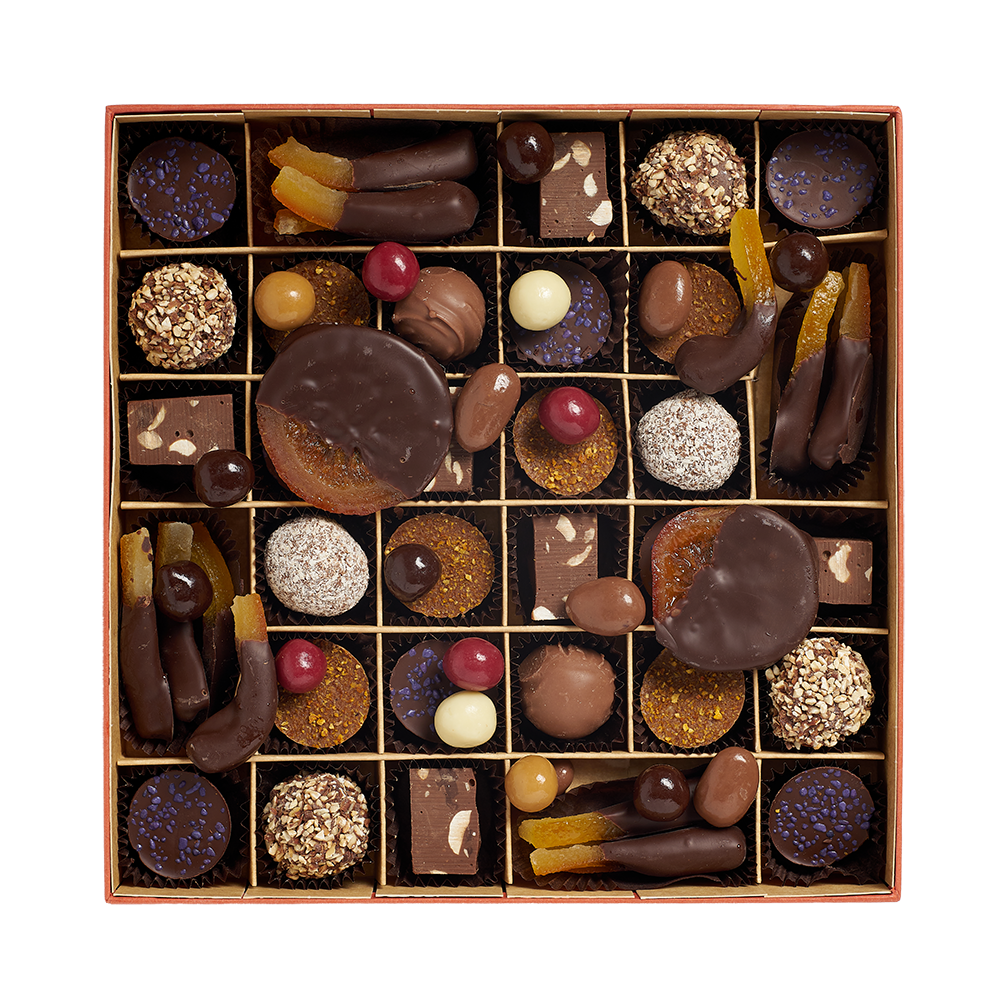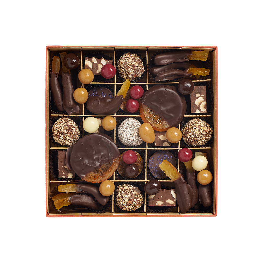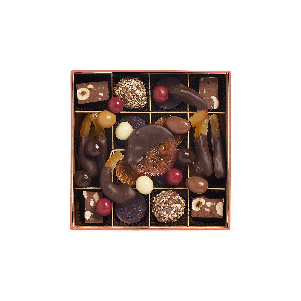 Cioccolato fondente (Cacao 55%-fave di cacao, burro di cacao, zucchero, emulsionante: lecitina di soia), Cioccolato al latte (Cacao 40%-burro di cacao, Latte intero in polvere, zucchero, fave di cacao, zucchero di canna, emulsionante: lecitina di soia, estratto naturale di vaniglia, emulsionante: lecitina di soia, estratto di malto d’orzo), Cioccolato Gianduia (nocciole 35%, zucchero, latte intero in polvere, burro di cacao, fave di cacao, estratto naturale di vaniglia), Nocciole, Mandorle, Scorze d’arancia candite (scorze d’arancia, zucchero, sciroppo di glucosio), Zenzero candito (zenzero, zucchero, sciroppo di glucosio, acidificante: acido citrico), Scorze di limoni candite (scorze di limoni, zucchero, sciroppo di glucosio), Zucchero, Cocco disidratato. Può contenere: Lattosio, Glutine, Uova, Arachidi, Frutta a guscio, Soia e derivati