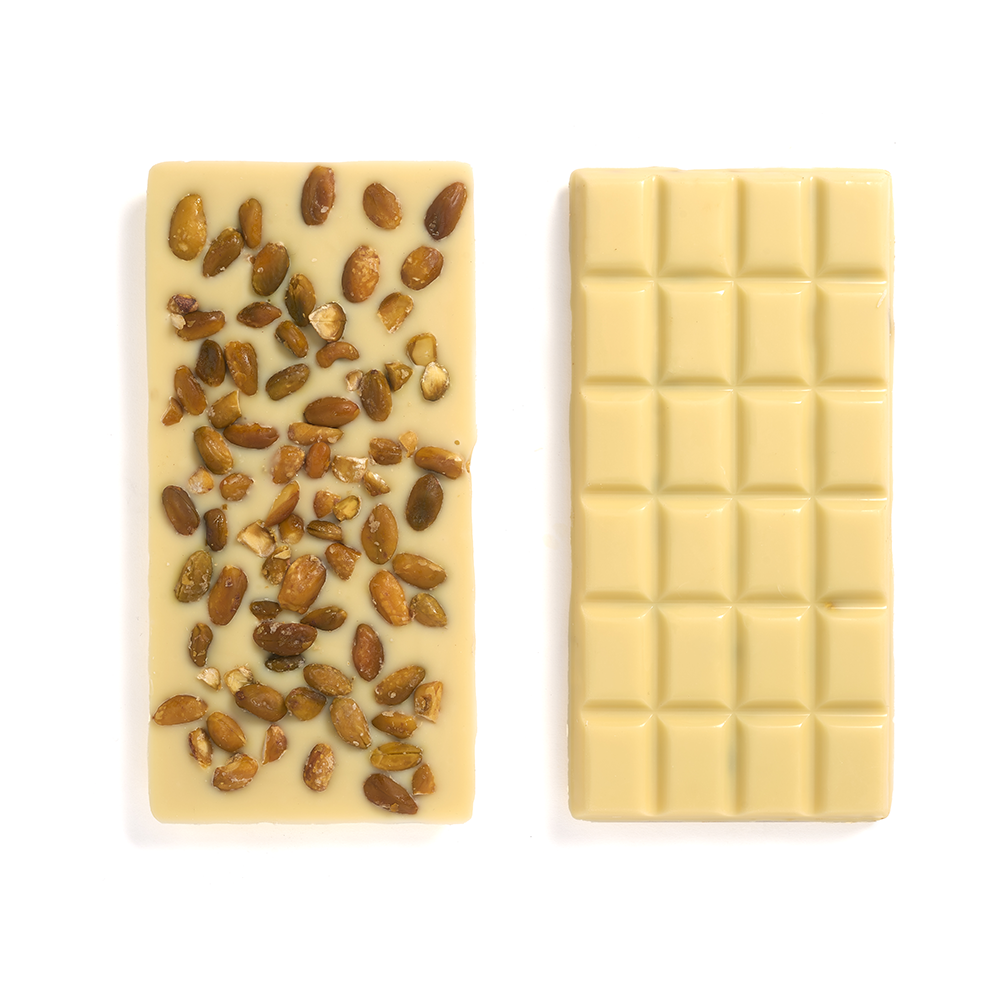 Tavoletta di finissimo cioccolato bianco, dal sapore cremoso e seducente, arricchita da deliziosi pistacchi tostati.