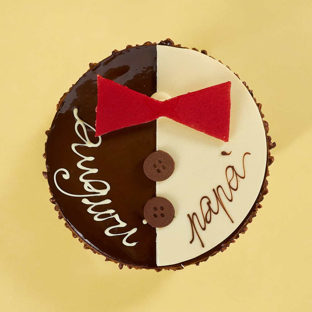 Elementi decorativi (Cioccolato fondente nocciolato (cioccolato fondente (cacao min. 55% – pasta di cacao, zucchero, burro di cacao, emulsionante: lecitina di SOIA, aroma naturale di vaniglia), granella di NOCCIOLA, burro di cacao), Cioccolato bigusto fondente/bianco (cioccolato fondente (cacao min. 55% – pasta di cacao, zucchero, burro di cacao, emulsionante: lecitina di SOIA, aroma naturale di vaniglia), cioccolato bianco (zucchero, burro di cacao, LATTE intero in polvere, LATTE scremato in polvere, emulsionante: lecitina di SOIA), Bottoni di cioccolato fondente (cioccolato fondente (cacao min. 55% – pasta di cacao, zucchero, burro di cacao, emulsionante: lecitina di SOIA, aroma naturale di vaniglia))).